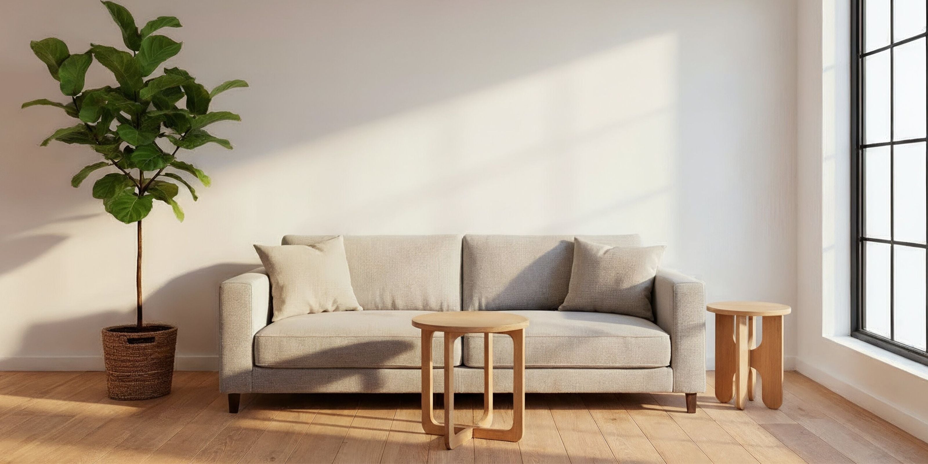 Du entscheidest über die Optik: unbehandelt bestellen und selbst lackieren, oder ein Finish von uns wählen (Kaffeebraun, Lavendel, Königsblau). Beide Beistelltische funktionieren auch als Hocker.